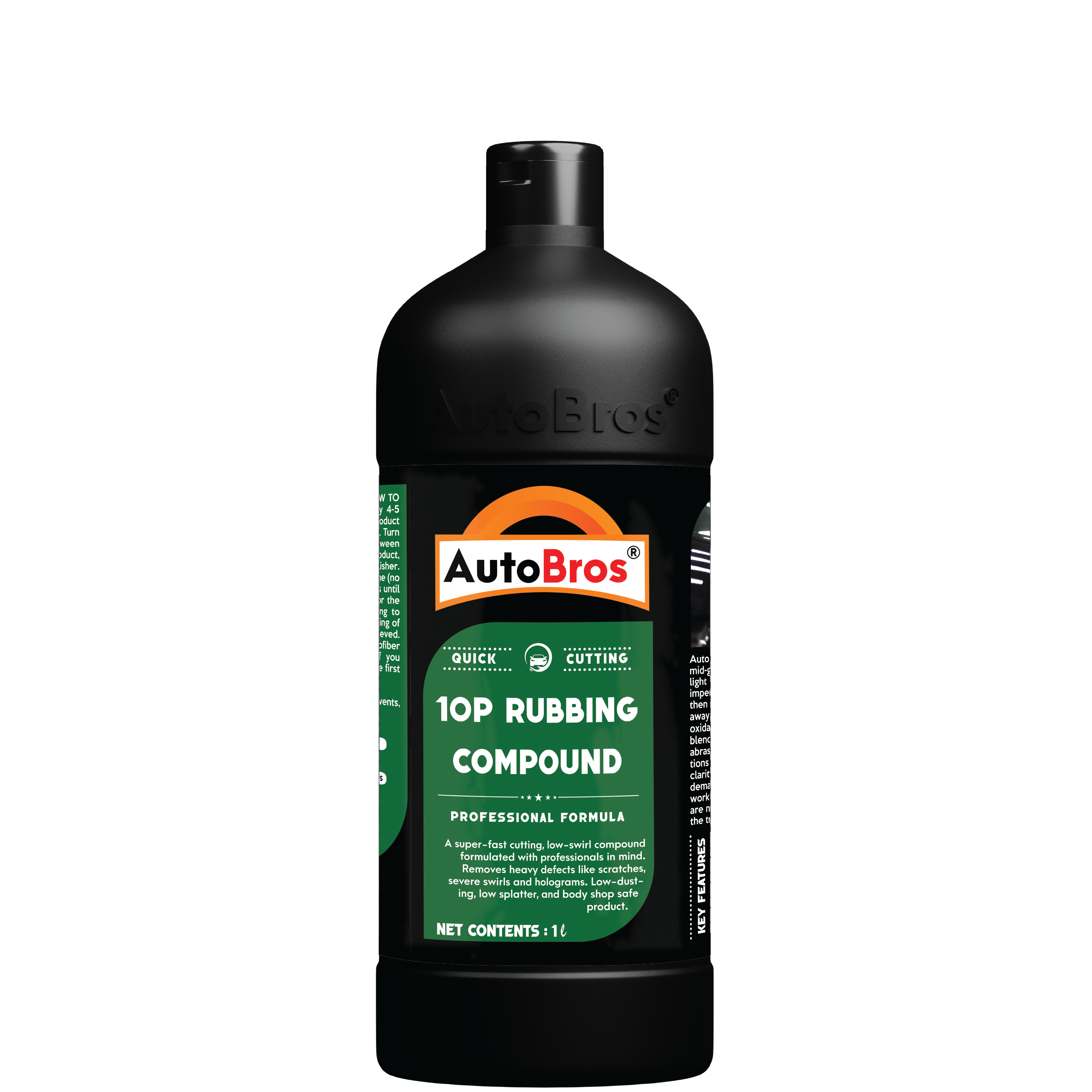 A super-fast cutting, low-swirl compound formulated with professionals in mind, to remove heavy defects like scratches, acid rain, severe swirls and holograms, and up to 1500 grit sanding marks. Autobros 10P Rubbing Compound is a high solids product that powers through defects while being a low-dusting, low splatter, and body shop safe formula. This compound is safe and effective on all glossy paints including aftermarket, OEM, clear coats, lacquers, and enamels. Formulated specifically for use with a rotary buffer, DA polisher or manual hand application.
