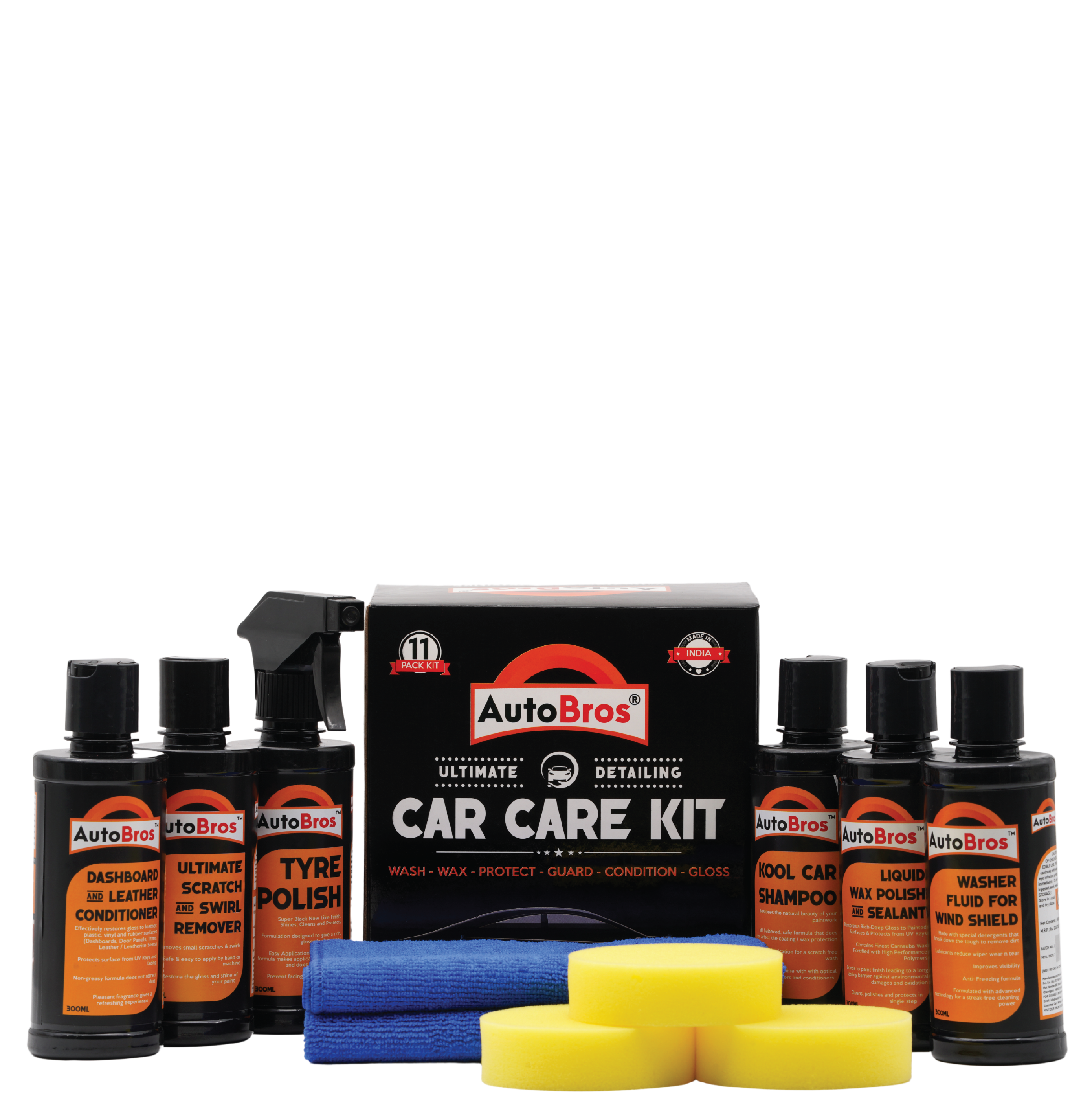 Auto Bros Detailing Kit gives enthusiasts control of their own vehicle’s destiny by providing everything they need for a perfectly detailed car. This kit carries the essential tools to wash your car, clean and defend leather, shine and protect wheels, improve visibility and leave the paint’s exterior with a phenomenal shine. Begin the regimen by washing away layers of stuck-on dirt and filth with polymer-powered Bucket Wash Car Shampoo. Use the professional grade premium Microfiber Towel for a careful dry that will not leave paint with any scratches or swirls. Use Ultimate Scratch and Swirl Remover to remove minor scratches, stains and paint transfer marks. Shine and protect your wheels and black trim by using Tyre Dressing Polish. Spread a coat of Liquid Wax Polish with sealant by using the Foam Applicator Pad, and you’ll quickly be amazed at the deep wet shine that has now been revealed. Don’t forget that it’s the inside that counts; protect the leather interior from fading, discoloring or cracking by nourishing and restoring with Dashboard and Leather Conditioner. Refill the windshield tank with Washer Fluid Additive for better visibility and a safer driving experience. The Auto Bros Car Detailing Kit gives enthusiasts the power and confidence to know they can have a car looking just as good as the ones done by professionals.