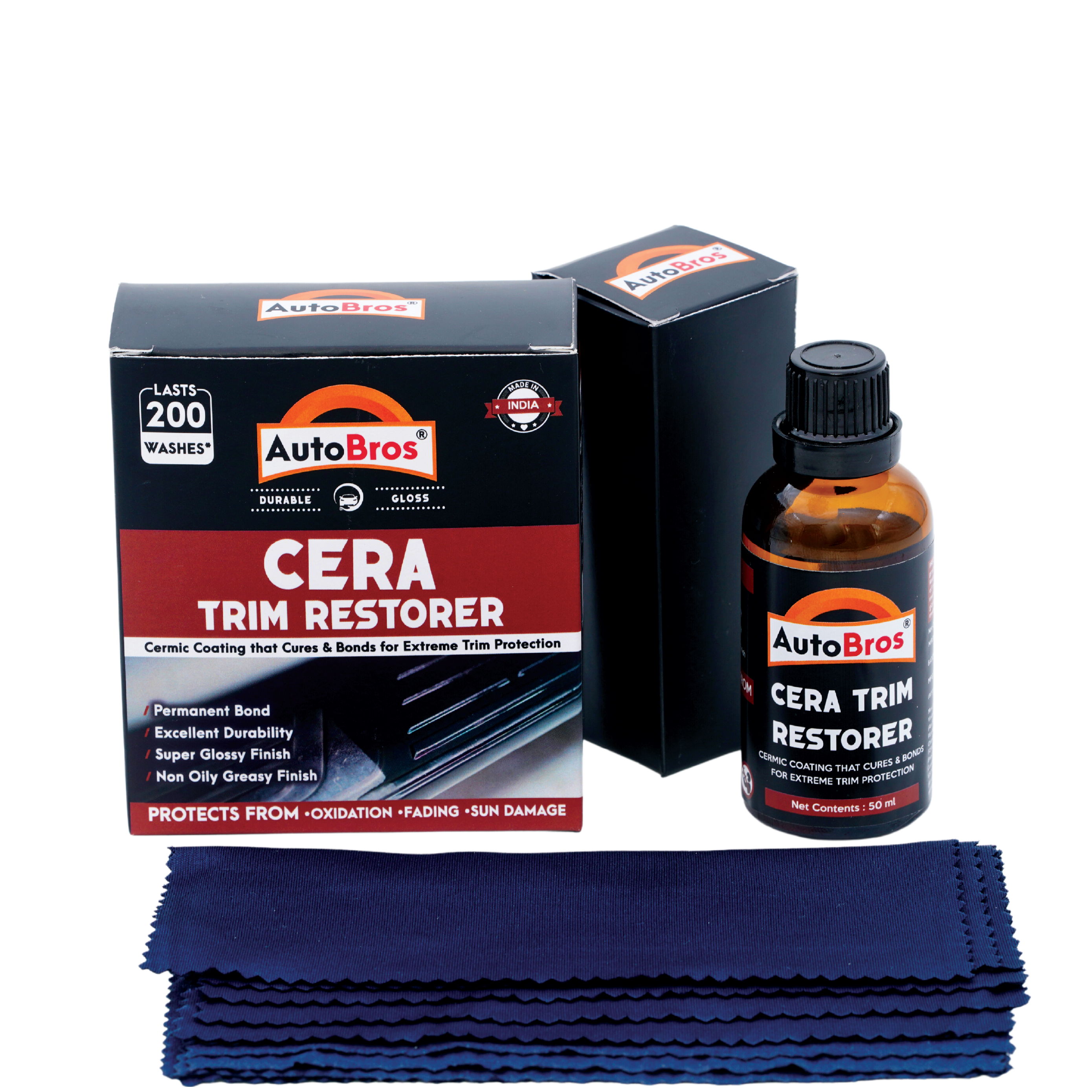 Introducing CERA Trim Restorer: Your ultimate solution against oxidation, fading, and sun damage. Our advanced Si02 formula creates a permanent bond, ensuring unparalleled durability and a captivating super glossy finish. Say goodbye to greasy, temporary dressings – this non-oily, non-greasy formula withstands washes for lasting brilliance. Easy to use with no certification needed, it effortlessly revitalizes unpainted plastic trim, restoring it to its original glory. The inclusive kit features a 50 ml bottle of AutoBros Cera Trim Restorer, gloves, and a non-absorbent cloth. Elevate your trim game with a true Ceramic Si02 coating for unmatched protection and elegance.