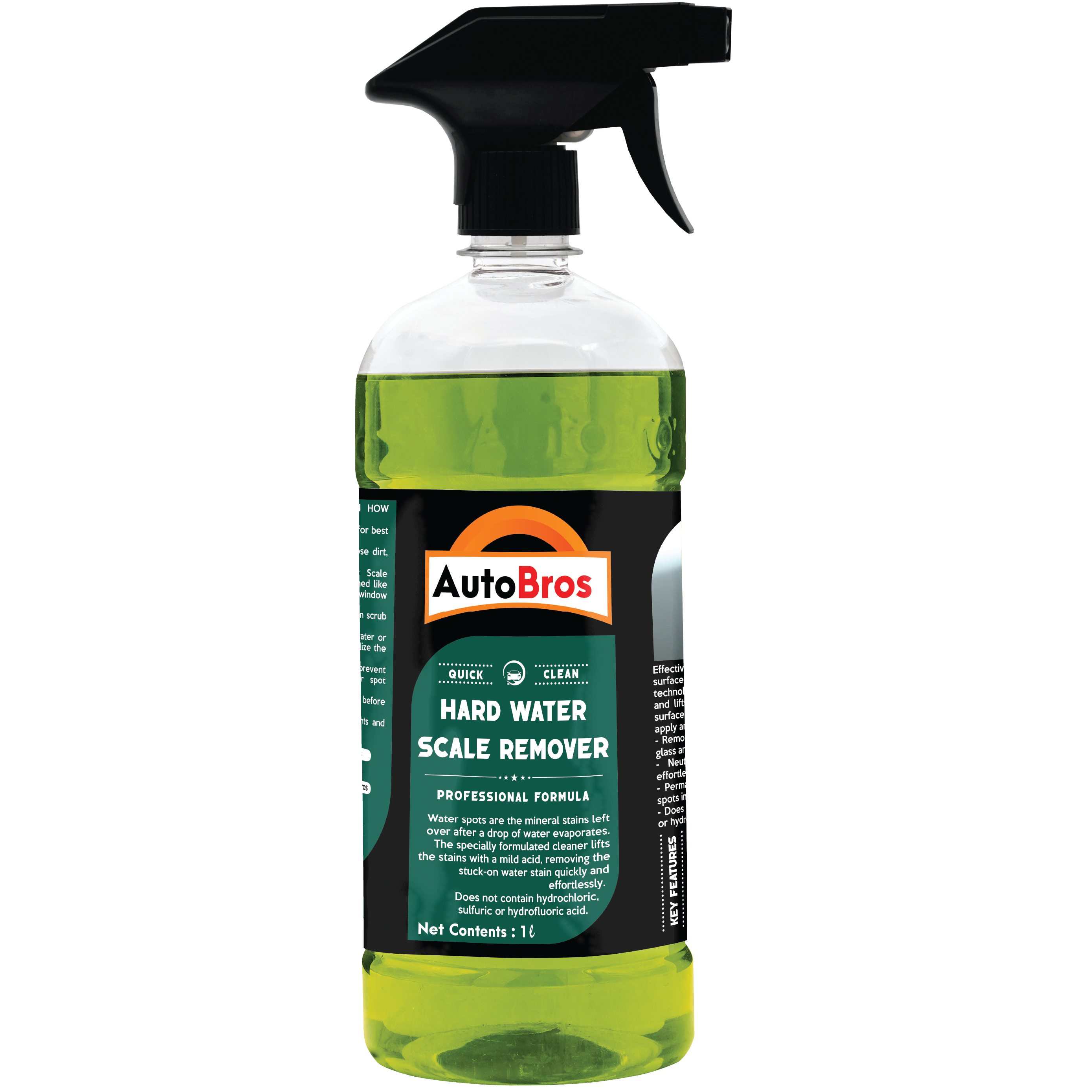 • Spray AutoBros Hard Water Scale Remover on the area to be cleaned like logos, fuel tank, engine bay, grill, window glass etc.